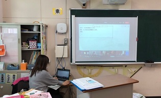 「ホワイトボード」機能を使って、いつもなら黒板に書くことをパソコンに入力しています。教室にいる子も、自宅にいる子もそれをもとにノートに写したり、問題を解いたりしています。