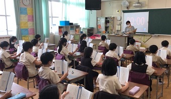 3年生の国語の学習の様子です。姿勢よく、教科書もたてて教材文を音読しています。音読の響き合う声が心地よく聞こえます。
