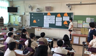 5年生の算数の学習の様子です。四角形の内角の和を求める方法について、グループで話し合った結果をホワイトボードに記して、それをもとに意見交流を深めて問題解決を図っています。