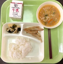 5月28日(金)の献立は きびなごの天ぷら 豚汁 わかたけ煮 ごはん 牛乳 でした。