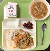 9月2日(木)の献立は 他人どんぶり 冬瓜のみそ汁 金時豆の煮もの 牛乳 でした。