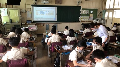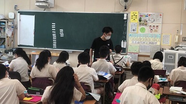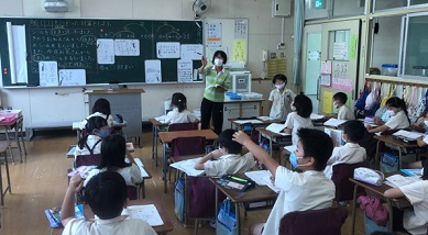 6年生の家庭科の学習の様子です。本来ならば、家庭科室に移動して学習しいところですが、家庭科室のレイアウト上、対面になってしまうので教室での実習です。ミシンを教室の前に3台持ち込んで、交代でミシン縫いをし、それ以外の子は自席で作業をしていました。