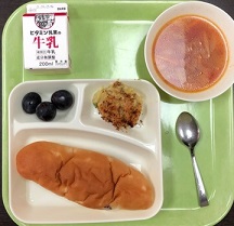 豆乳マカロニグラタン トマトスープ ぶどう(巨砲)