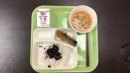 10月15日(金)の献立は さんまのみぞれかけ みそ汁 牛ひじきそぼろ ごはん 牛乳 でした。
