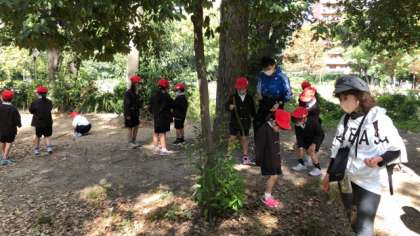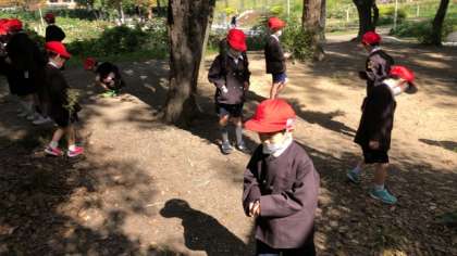 3組は、秋見つけタイムです。どんぐりなどを拾っています。