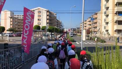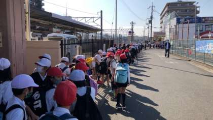 秋晴れのもと、4年生99名、全員揃って深北緑地に校外学習に向かいます。