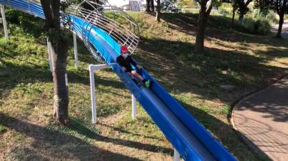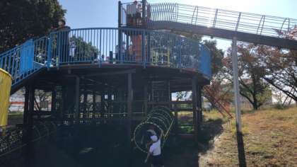 まだ他の学校が来ていないので、遊具貸切状態。野田の街中にはない大きな遊具で、楽しんでいます。