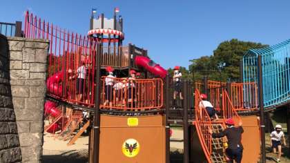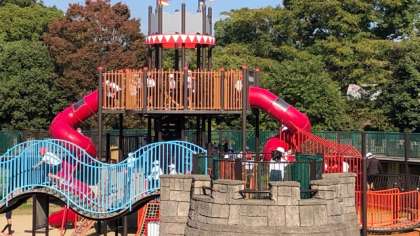 大きな砦の遊具で絶叫しています。