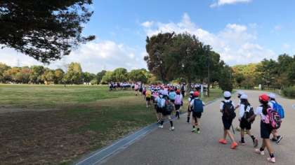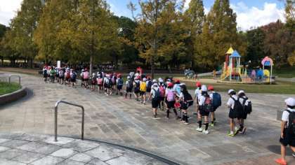 たっぷり遊んだ砦広場から芝生広場に移動しました。ここで、学年全体遊びをする予定です。