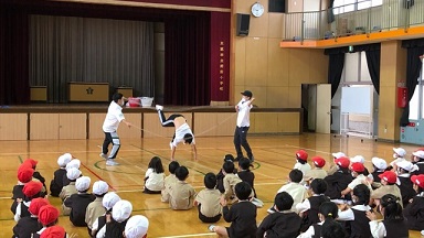 来ていただいたのは3名なのですが、インストラクターのユニフォームを着ておられるのは4名です。実は、4人目のインストラクターは、何と、5年生の担任の屋良先生。屋良先生は学生時代に、このfat man crew のメンバーとして活動していたそうで、子どもたちもびっくり。そのパフォーマンスにはひときわ大きな拍手が起こっていました(写真下)。