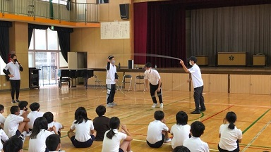 今年は野田小に順番が回ってきたので、fat man crew のメンバーが3名来校され、ダブルダッチ体験を行いました。