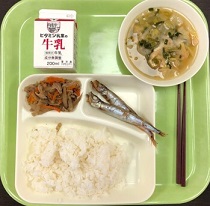 11月18日(木)の献立は 焼きししゃも 五目汁 きんぴらごぼう ごはん 牛乳 でした。