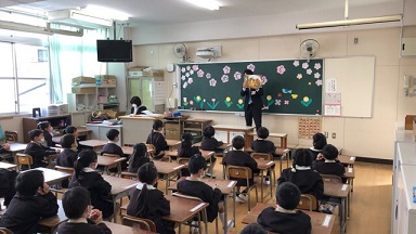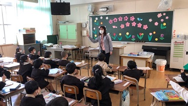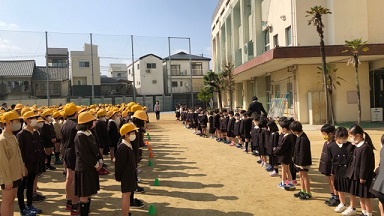 まずは、2〜6年生の始業式が終わるのを待って、運動場での対面式。お姉さん、お兄さんたちに元気よく「よろしくお願いします」と言えました。