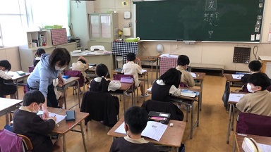 5年生の学級活動の様子です。掃除分担を決めているようでした。先生が事前にPCでつくっておいた表をプロジェクターで映写し、それを見ながら考えていました。