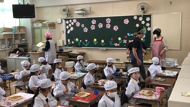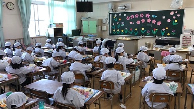 6年生にも手伝ってもらい、初めての配膳。少しずつ慣れて、自分たちでできるようになっていきましょうね。