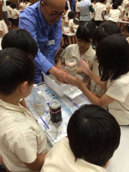 見学の後で、各クラス小グループに分かれて水をきれいにする実験をしました。