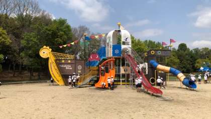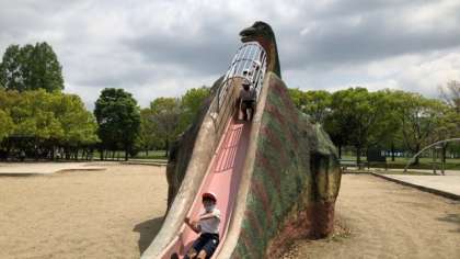 大きな恐竜の滑り台とディノザウルスアドベンチャーという名の遊具があります。