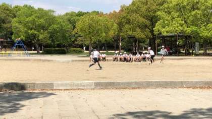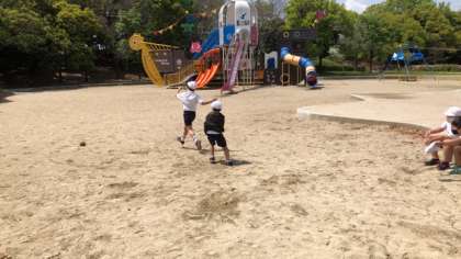 2組は恐竜広場で、クラシックな遊び、缶蹴りです。缶はあぶないのてスポンジボールを代用。遊具で誰も遊んでないので、隠れ放題です。