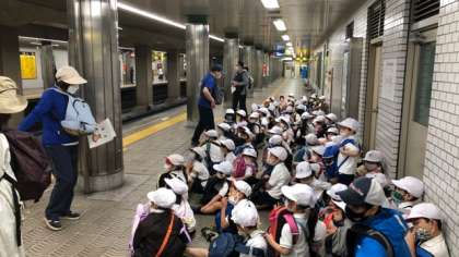 1年生、はじめての校外学習です。行き先は八幡屋公園。玉川駅から地下鉄に乗って、阿波座駅で乗り換え、朝潮橋駅まで行きます。