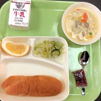 コーンクリームシチュー キャベツときゅうりのサラダ かわちばんかん