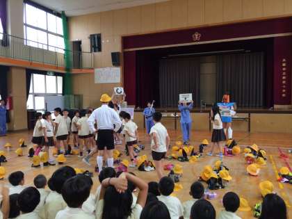 「ごみとくらし」について、ショートコントを交えながらわかりやすく説明していただいたあと、○×クイズや班対抗クイズ大会、パッカー車乗車など、盛りだくさんの内容で体験学習をしてくださいました。