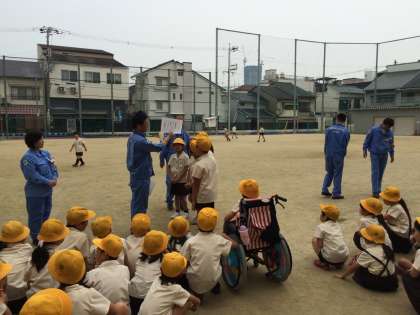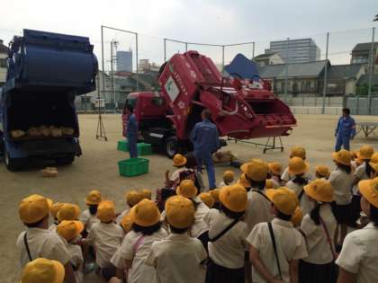 6月16日(火)、社会科の学習の関連で、環境事業局の方々がパッカー車(ゴミ収集車)で本校に来てくださいました。