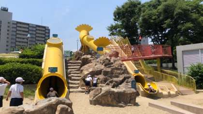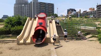 昼食後はキッズプラザを退館し、扇町公園の遊具で遊んでいます。風があって心地よい感じです。