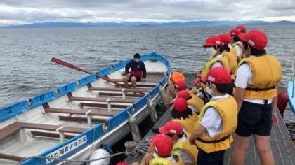 桟橋まで出て、艇内での座り方や櫂の扱い方などの説明を受けています。風が強く波が立っているので、安全第一。カッターには乗らず桟橋から説明を受けています。