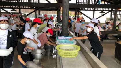 野外炊飯活動開始です。かまどに火をつける担当、お鍋を準備する担当など、班で決めた役割ごとに活動を始めました。