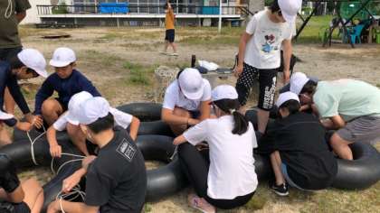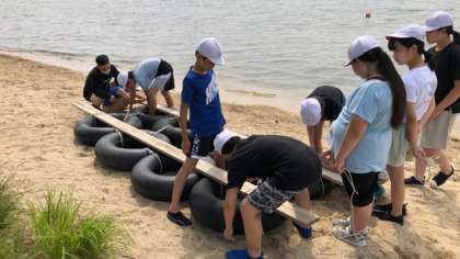 まずはタイヤチューブを並べてロープで繋ぎ、長い板を置いて、タイヤチューブと板をロープでつないでいきます。