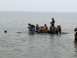 ライフジャケットを着て、パドルを借りて、湖面へ。大はしゃぎの子どもたちです。