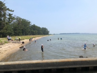 昼前になり、日が差して気温も上がってきました。散策チームは、水遊びというより湖水浴状態です。