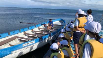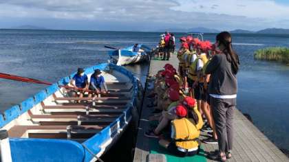 ライフジャケットを着て、桟橋まで行き、櫂の漕ぎ方などを教えてもらっています。