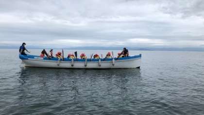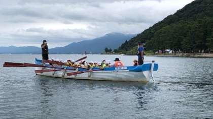 カッター組は休憩中。やっとゴールの白髭神社の鳥居が見えてきて、テンション高まってきました。
