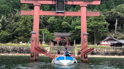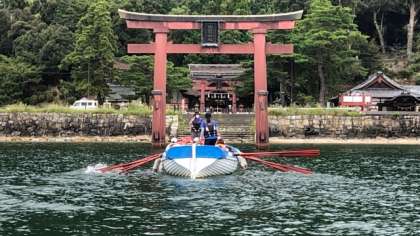 ?B班艇が、鳥居に向かっています。力と心を揃えて鳥居に付近まで進んでいきます。