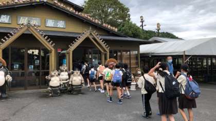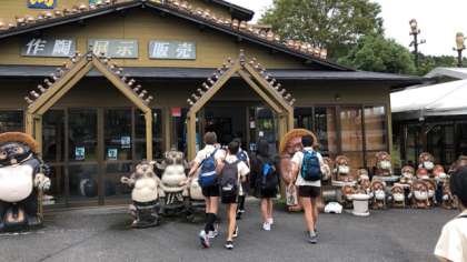 昼食場所の信楽陶芸村国道店に着きました。たくさんの狸がお出迎えです。