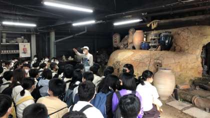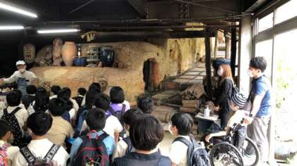 体験の前に、登り窯の前で、信楽焼について教えていただいています。