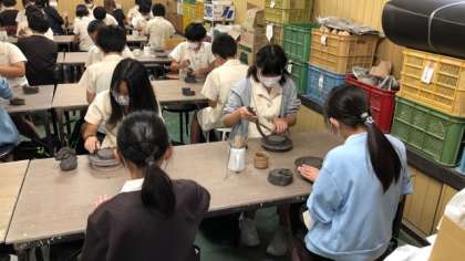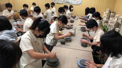 ろくろを回し、竹串を使って土台を丸く切り取ります。