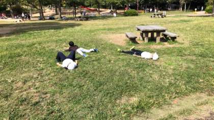 ビニル袋を持ってどんぐりを拾い集めている子、ひなたぼっこといって、芝生に大の字になって横たわっている子もいます。