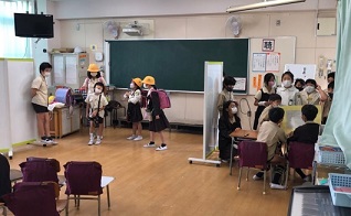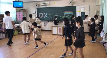 3班は、講堂で「キャタピラレース」です。(写真上)