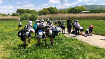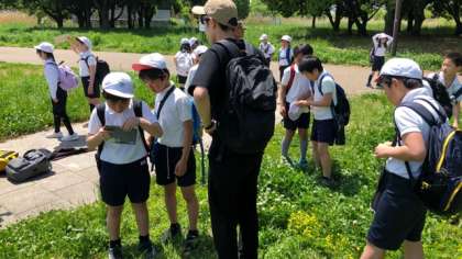 深野池周辺に移動して、班ごとに自然観察タイムです。班に1台持ってきたタブレットを使って写真撮影もしています。