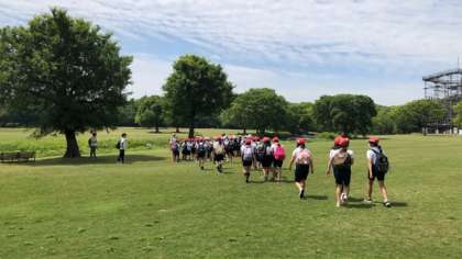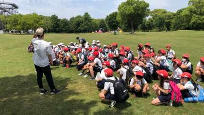 せせらぎ広場に到着。これから1時間強、グループオリエンテーリングです。9月の自然体験学習の前哨戦、グループで協力して、1970年大阪万博のレリーフを探します。