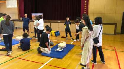19日から始まるプール水泳に先立ち、応急手当普及員の資格を持つ校長先生を講師に、普通救命講習を行いました。