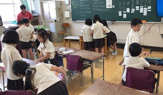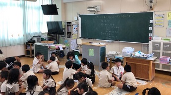久しぶりに会った級友と「夏休みの思い出」を出し合ったり(写真上 1年生)、さっそく2学期の係活動を決めたり(写真中 2年生)していました。