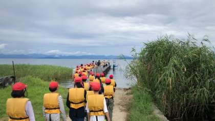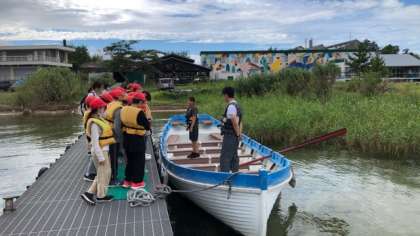 桟橋に行って、基本的な櫂の操作方法を教えてもらっています。