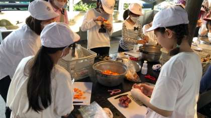 野菜や肉を鍋に入れ、カレーも火にかけ始めました。