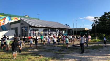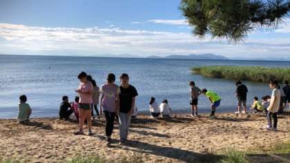 朝の集いで体操し、体を目覚めさせた後、現在は食事係りが朝食準備をしています。待っている子どもたちは、湖畔でのんびりした時間を過ごしています。