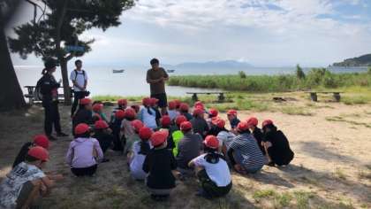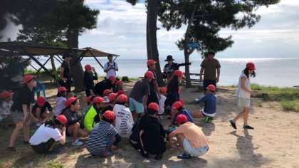 前半は1組がイカダづくり、2組が湖畔散策&湖水浴です。