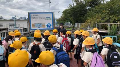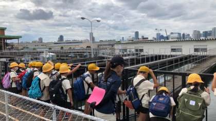 淀川から引き入れた水に、硫酸バンドという薬品を入れ、ゴミを固めて沈めていく様子を見学しています。