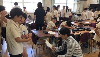 ワークショップ当日は、吉本興業からは、講師のかたお二人と若手漫才師のコンビが一組来られました。1時間目は、各組にてそれぞれのコンビで立ち稽古。そこに講師や芸人の方からアドバイスをもらって漫才を完成させていきました。